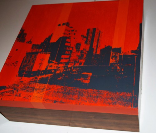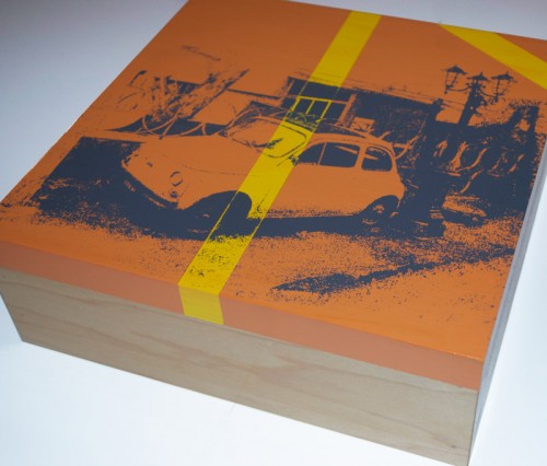 So the Curbside Traveling Box project or CTB is still underway and will be ready to go for our shop opening….First let me explain what it is. CTB is a collection of 12x12x4 inch boxes, painted & screen printed with Curbside travel photography from around the world. Round 1 will be 15 boxes, all original art with different images and backgrounds, that fit together like a puzzle. The idea is to create one collaborative piece that represents multiple perspectives on travel, but each piece will be sold individually to represent a single experience. From Right to Left we have images of Urbino Italy, Kerala India, New York City. 12 more boxes are one the way with updates & images coming soon.